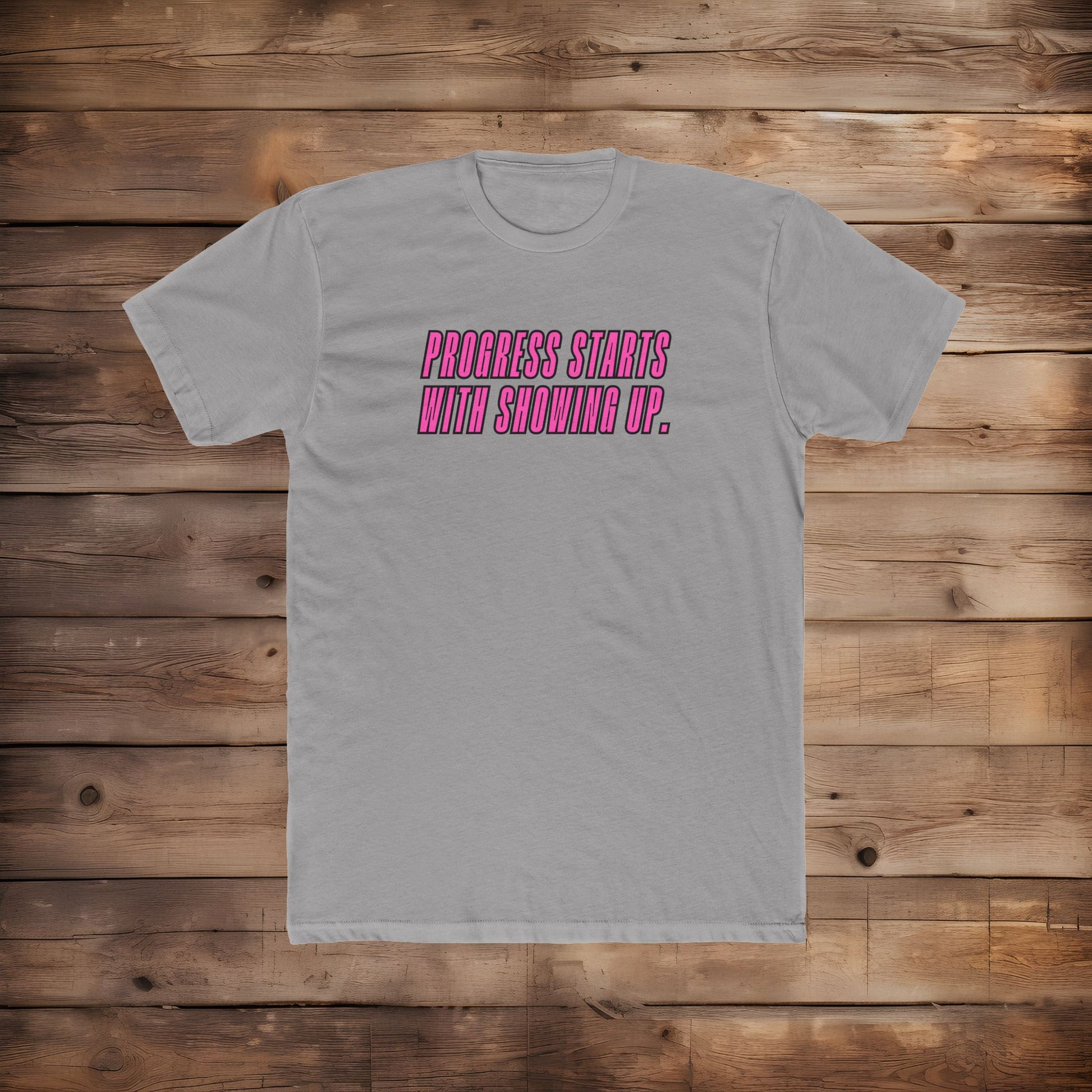 Effort meets style with this soft and breathable tee, perfect for gym sessions or casual wear. A simple yet powerful reminder that every step toward your goal starts with showing up—because progress only happens when you do.
